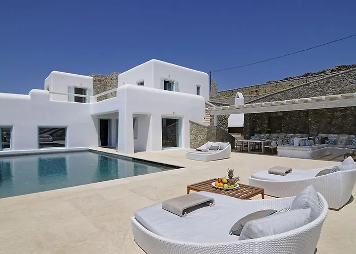 Het hart van Mykonos Town kan worden bereikt in 30 minuten lopen van de 17-badkamer villa, en cultuurgerichte locaties zoals het Archeologisch museum van Mykonos liggen binnen 10 minuten rijafstand. Gasten kunnen een bezoek brengen aan het Huis van Cleopatra, op afstand van 4 km van de villa, of een kijkje nemen bij het Klein Venetië, 2 km verder.